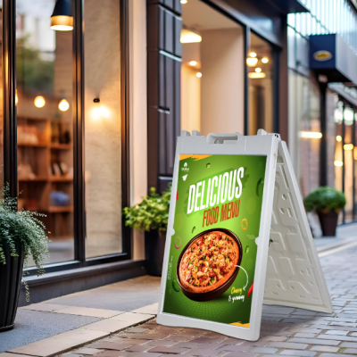 “Durable, lightweight, and weather-resistant, our Plastic A-Board Sign is perfect for outdoor and indoor promotions. Easy to set up and move, it's ideal for storefronts, sidewalks, and event signa